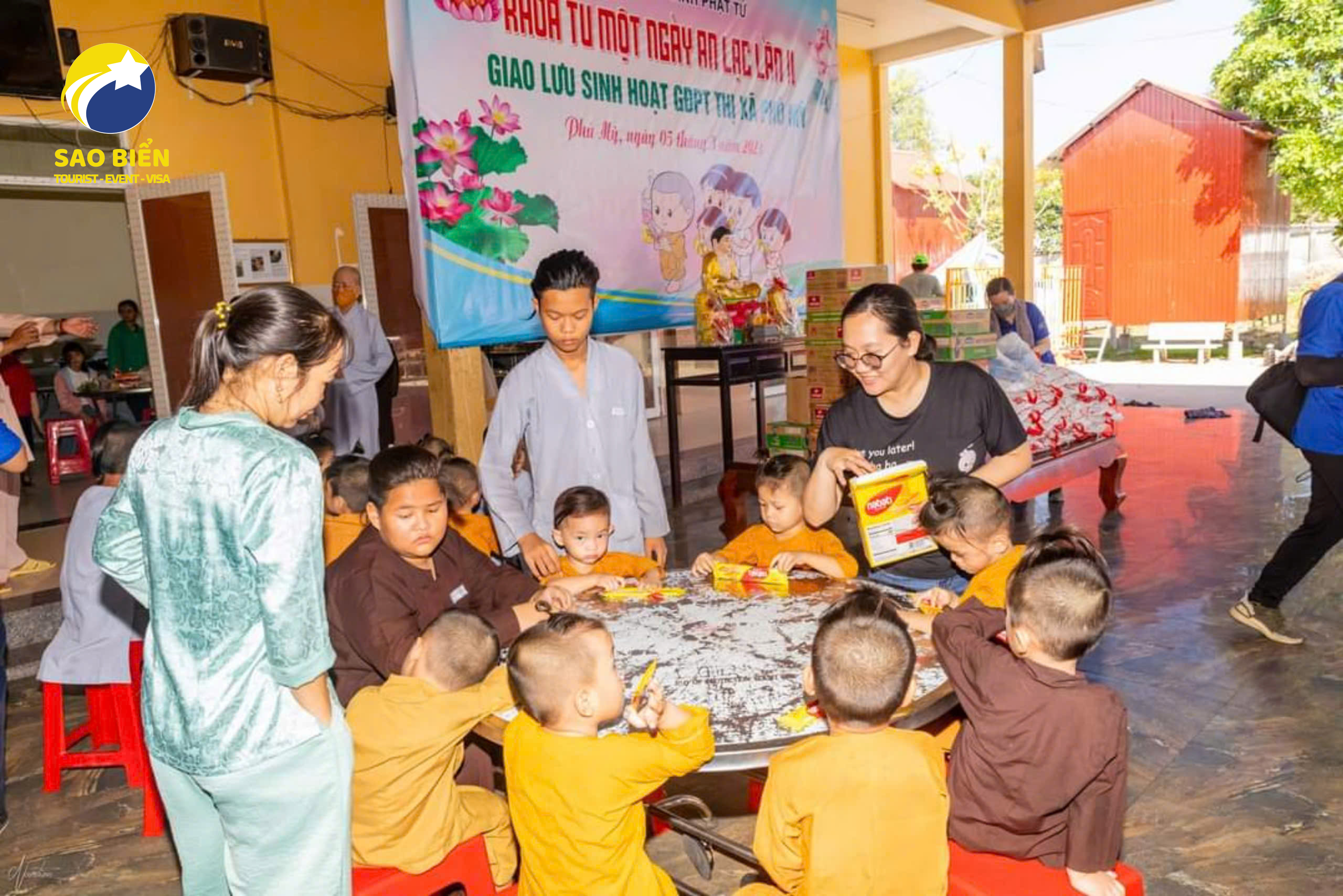Sau hành trình leo núi, đoàn đã đến thăm Mái ấm Hồng Quang – nơi nuôi dưỡng nhiều em nhỏ có hoàn cảnh khó khăn. Tại đây, Sao Biển Tourist đã trao tặng các phần quà bao gồm nhu yếu phẩm, đồ dùng học tập và một số tài trợ nhằm giúp đỡ các em trong cuộc sống và học tập. Những giây phút trò chuyện, lắng nghe và chia sẻ với các em nhỏ đã để lại nhiều ấn tượng sâu sắc và cảm xúc chân thành cho các thành viên trong đoàn.